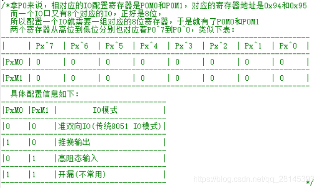 上述代码在STC的官方资料当中有介绍,根据资料介绍,每一个i/o口由2个控制寄存器中的相应位控制每个引脚工作类型。