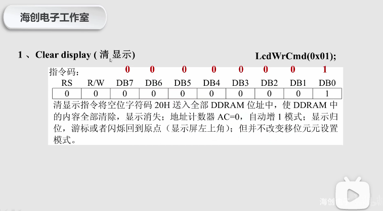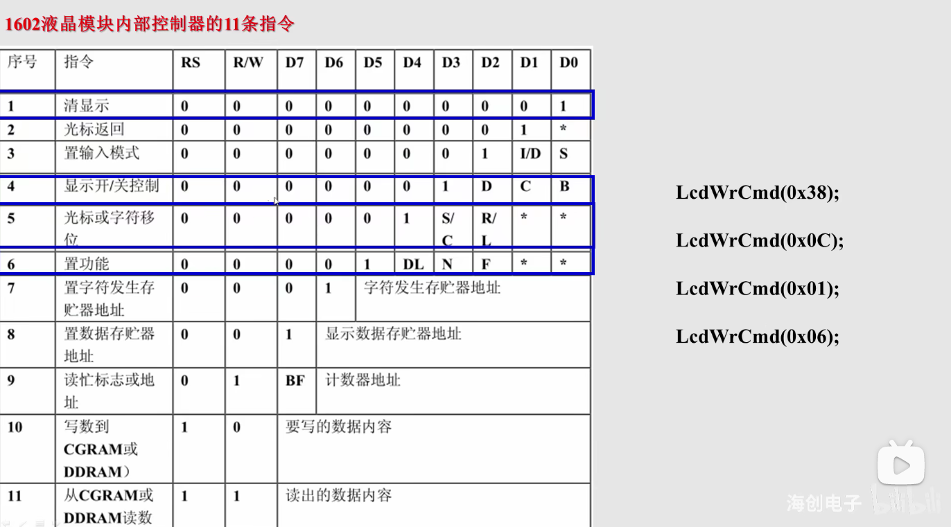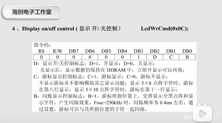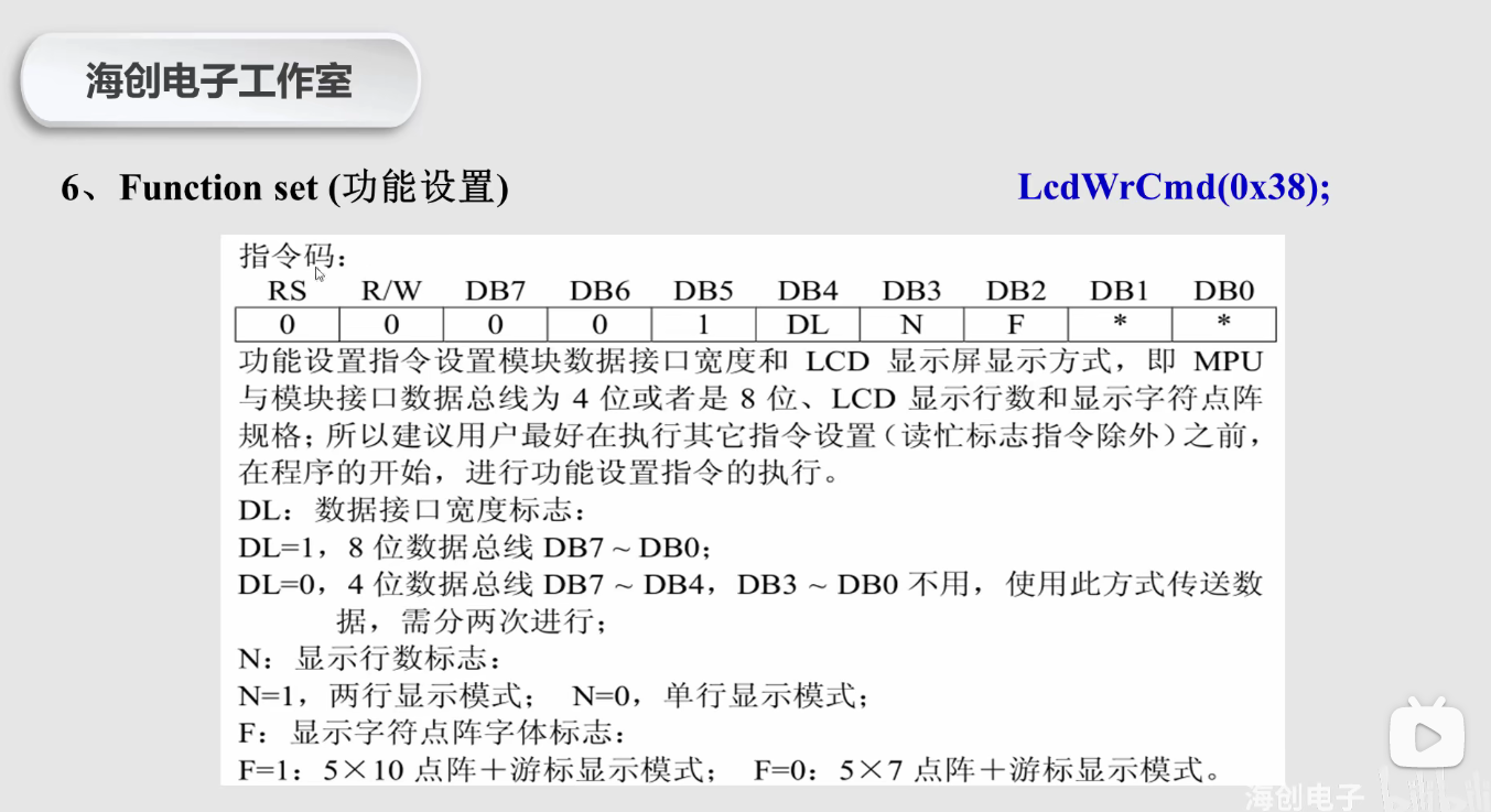 需要说明的是,当DL=1时,使用的是8位数据总线DB7-DB0,即所有的8个IO口。同理,当DL=0时,使用的是4位数据总线,即DB7-DB4,DB3-DB0不用,用此方式传送数据,需要分两次进行。